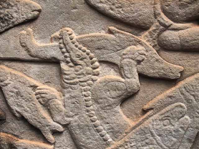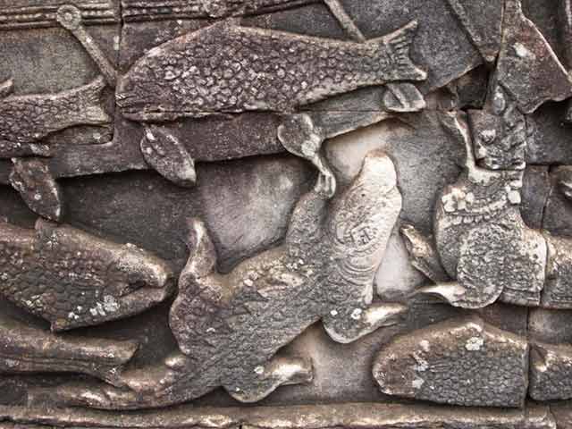 外回廊の壁面には、火をおこす人や串焼きを焼く人、出産シーン、闘鶏、闘犬、将棋を指すなど、人々の日常生活が彫刻されています。