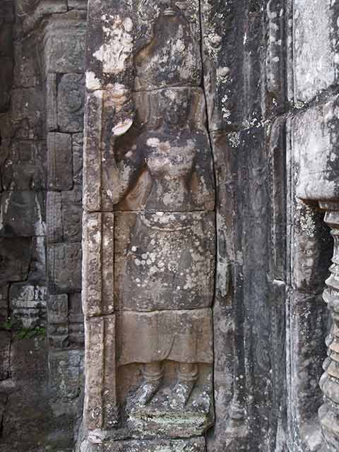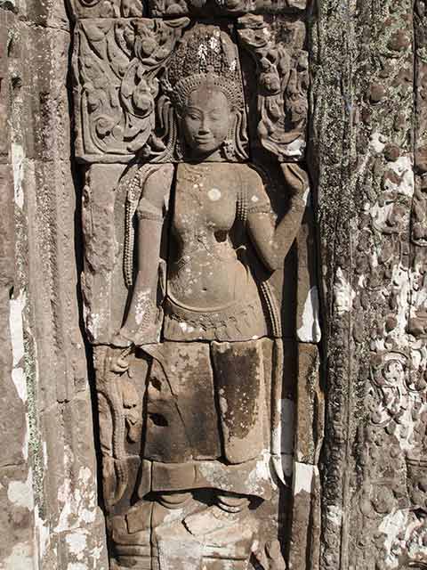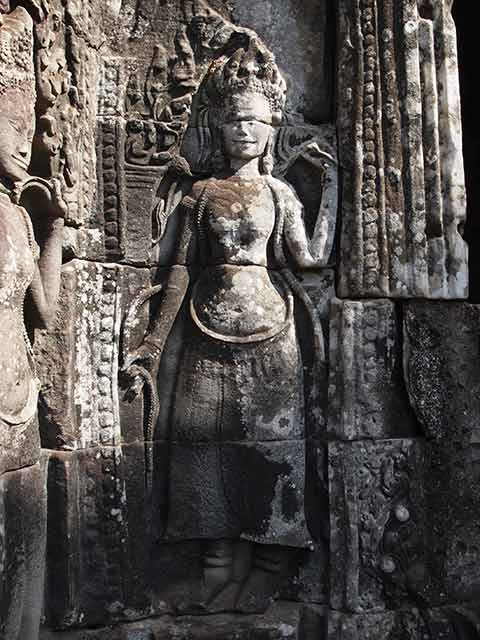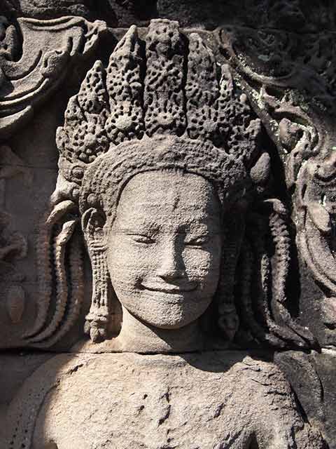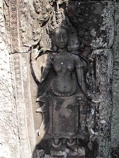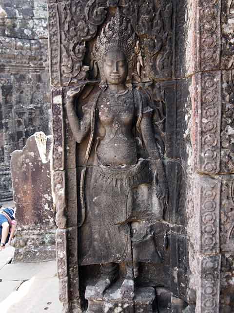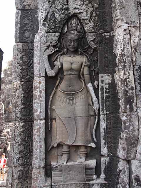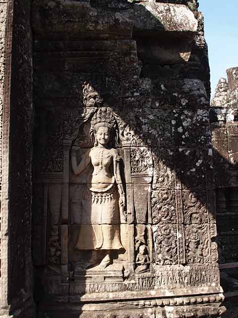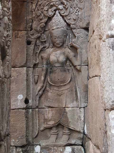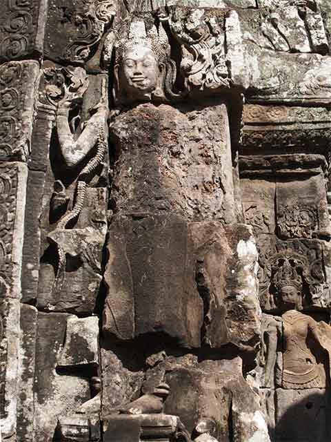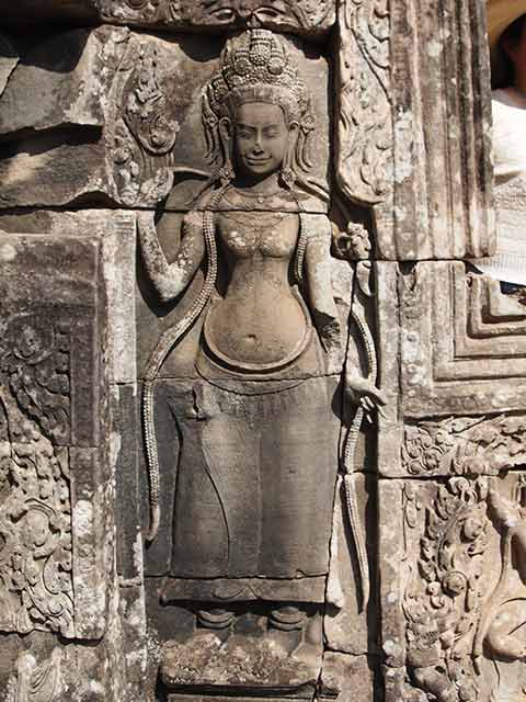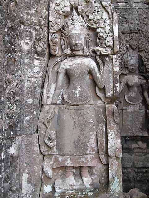 向かって左側が最初の妃で、若くして亡くなったジャヤラージャデーヴィーであり、向かって右側が2番目の妃で、ジャヤラージャデーヴィーの姉(?)にあたり、哲学や宗教にも通じ、ジャヤヴァルマンⅦ世の精神的な支えともなったインドラデーヴィーであろう。」