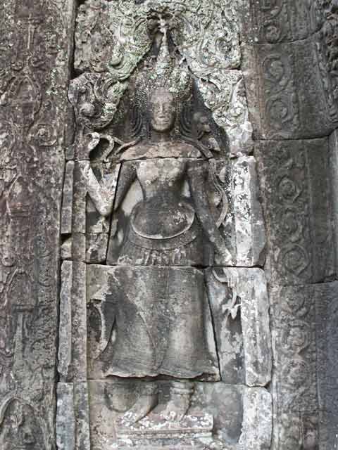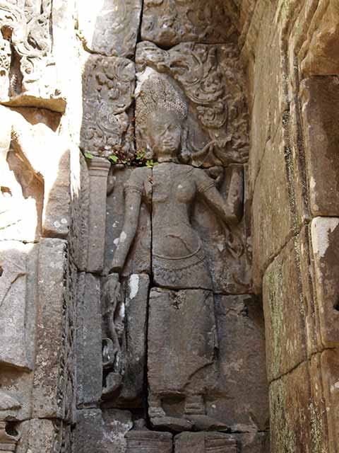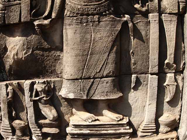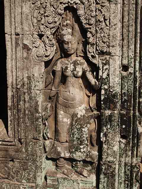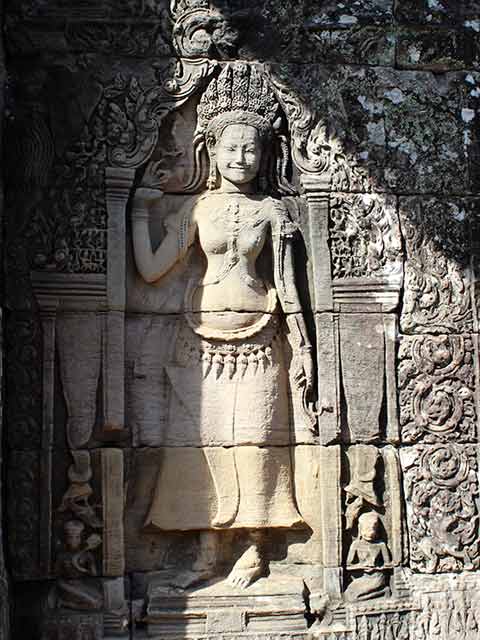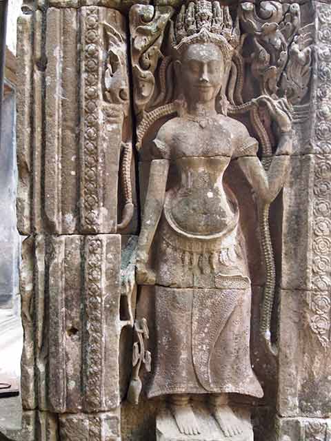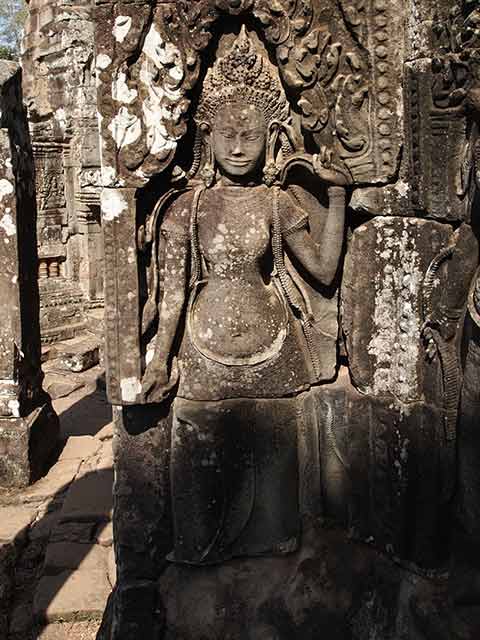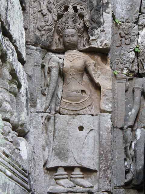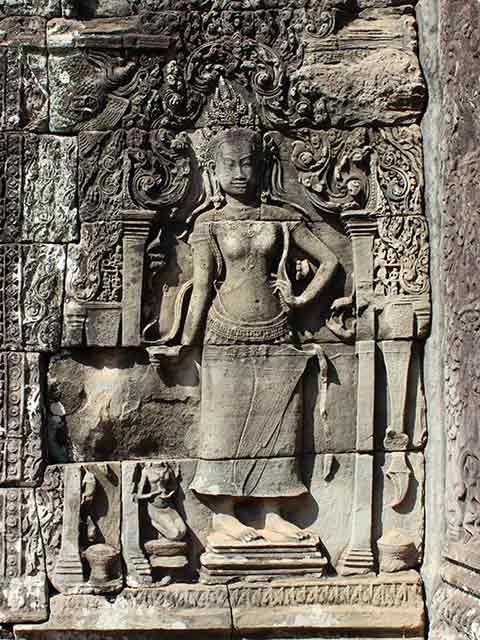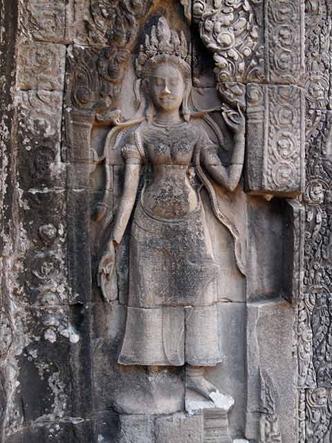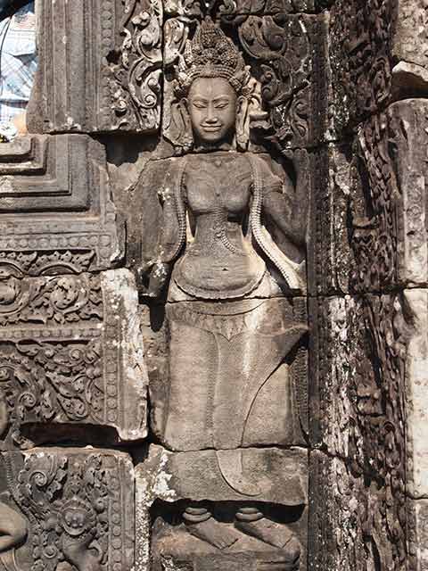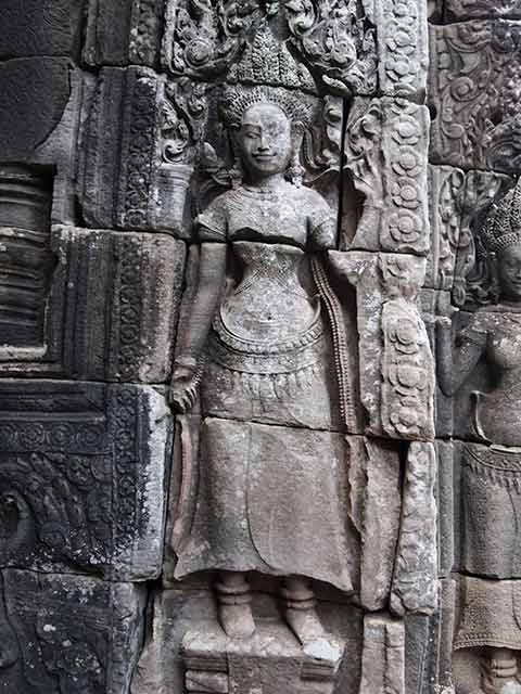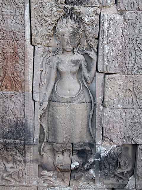 向かって左側が最初の妃で、若くして亡くなったジャヤラージャデーヴィーであり、向かって右側が2番目の妃で、ジャヤラージャデーヴィーの姉(?)にあたり、哲学や宗教にも通じ、ジャヤヴァルマンⅦ世の精神的な支えともなったインドラデーヴィーであろう。」