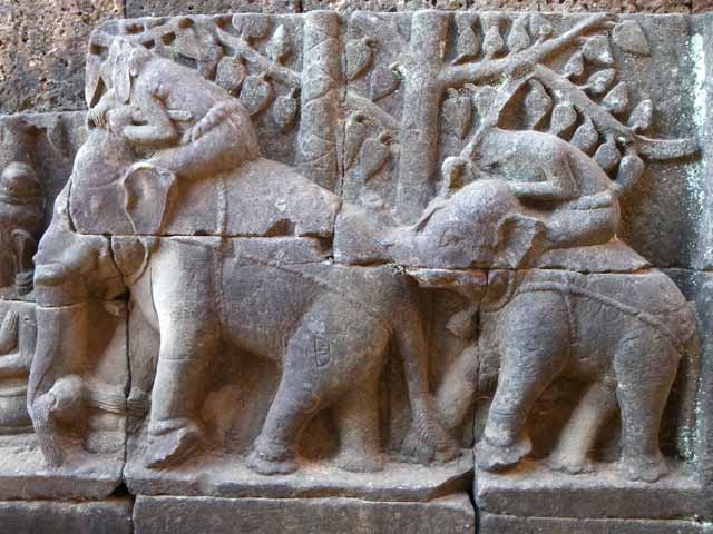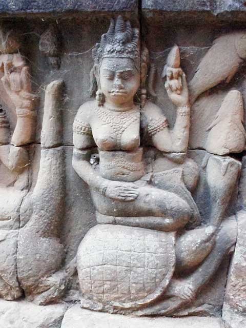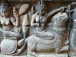 壁面は、多数の段に分かれていて、上から下までぎっしりとヤクシャや従者、デヴァター、ナーガ、象、亀やカニなどが刻まれています。