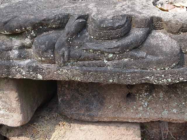 牛に乗って戟を持つ神のレリーフ(ヤマ)が、何故か、境内の地面に置かれています。