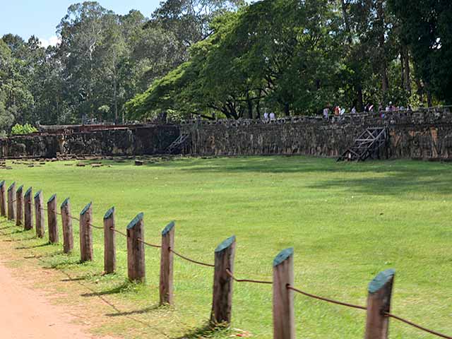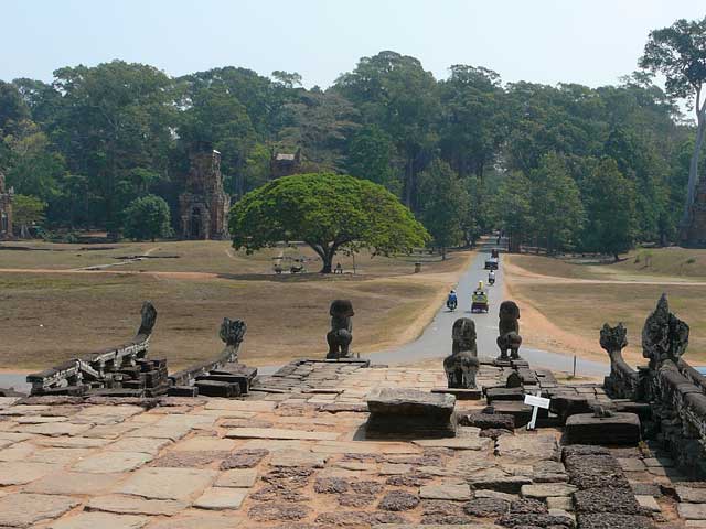象のテラスから、間隔をおいて一列に立ち並んでいる12基の小さい赤いラテライト造りの祠堂プラサート・ソー・プラットが森を背景にして見えます。