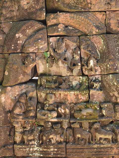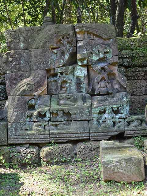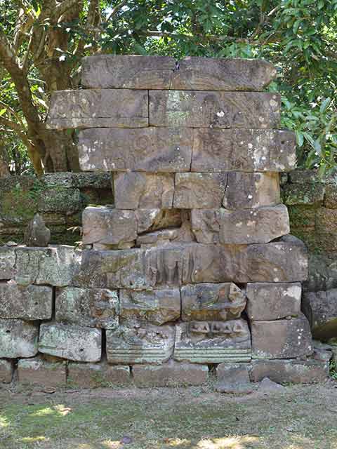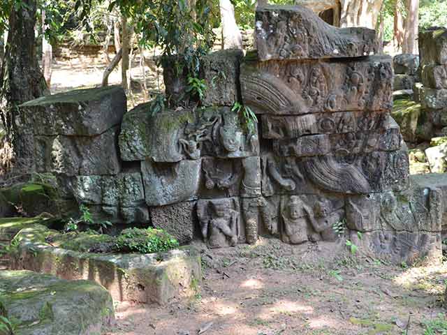 ローケーシュヴァラが彫られた破風が内周壁の壁に沿って地面に置かれています。