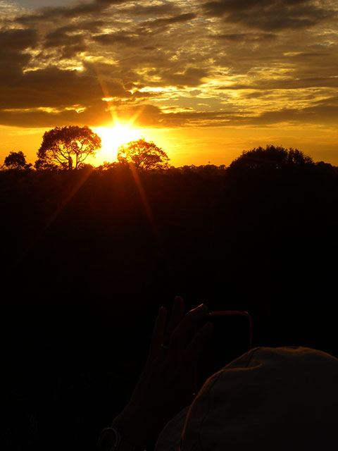 ラテライトの基壇とレンガ造りの祠堂が織り成す色模様