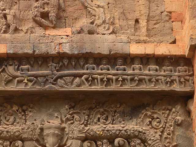 中央祠堂のリンテルに、乳海攪拌が刻まれています。