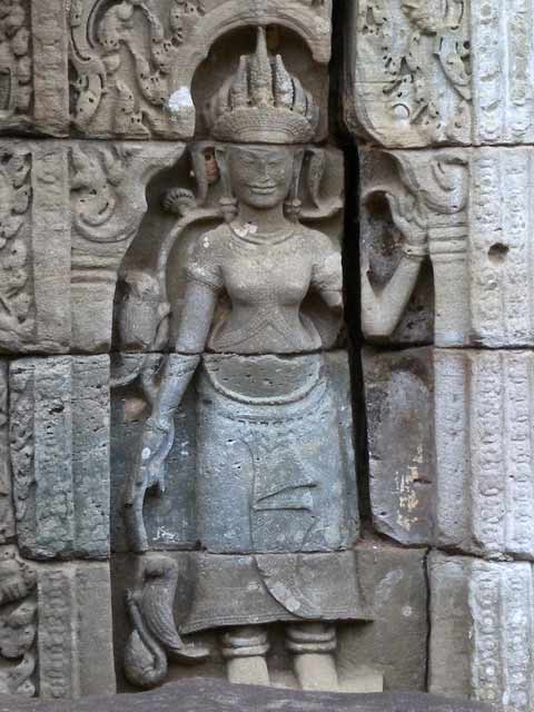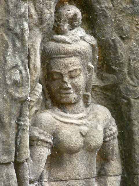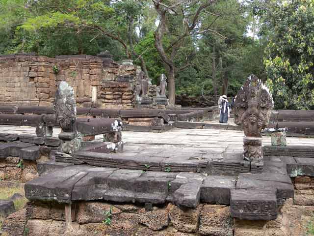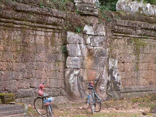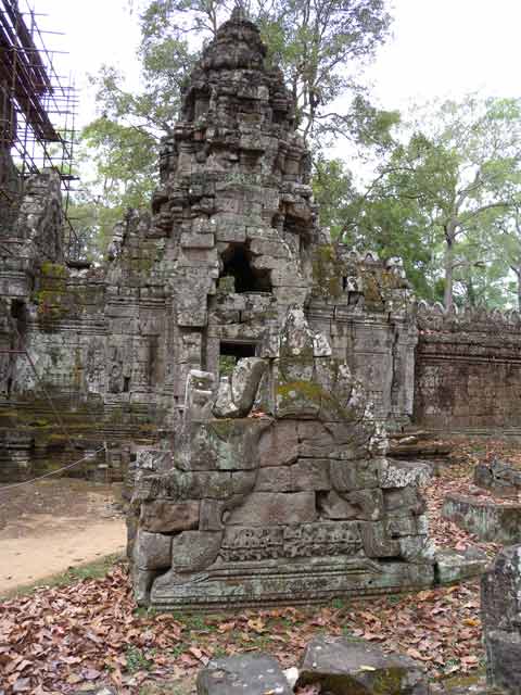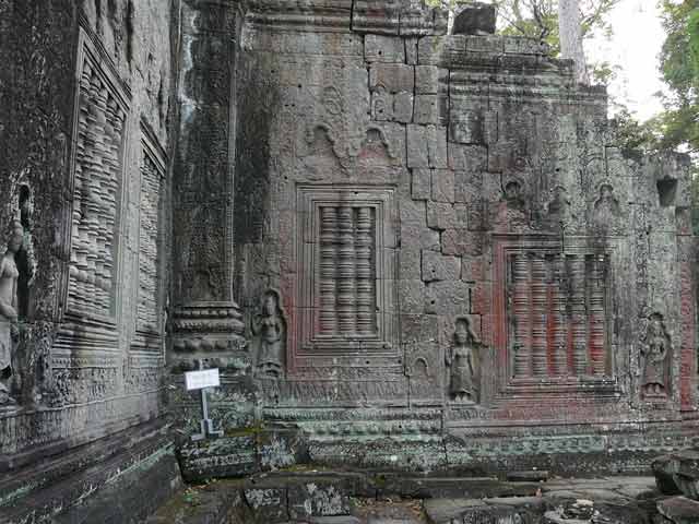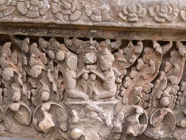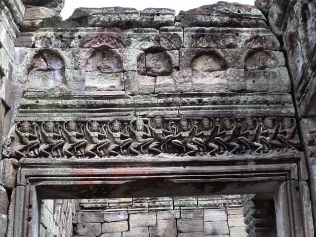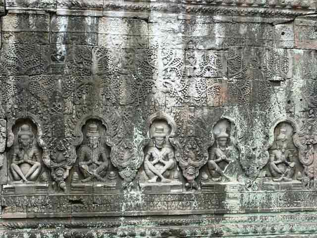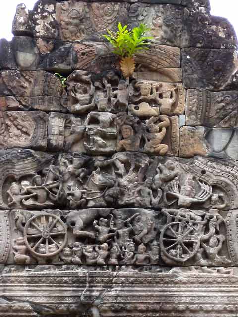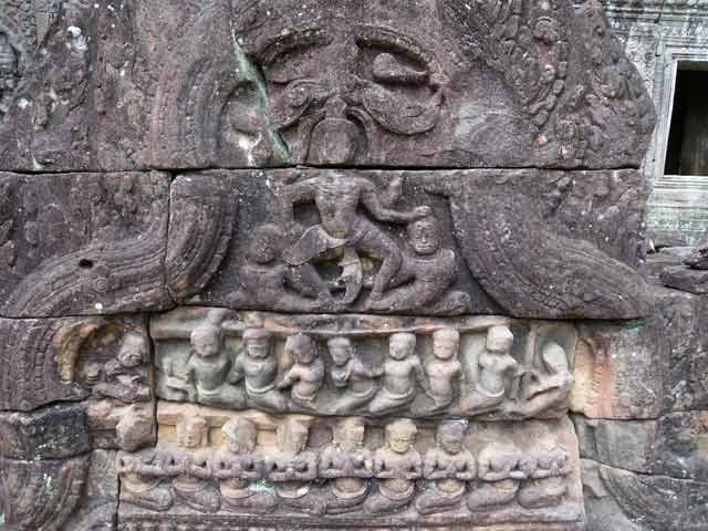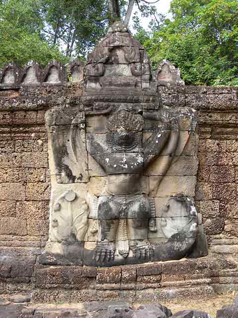 周壁にはヒンドゥー教の神鳥ガルーダの上に坐仏が彫られていましたが、ジャヤヴァルマン7世の死後、宗教的確執のため仏教の象徴である坐仏は削りとられています。