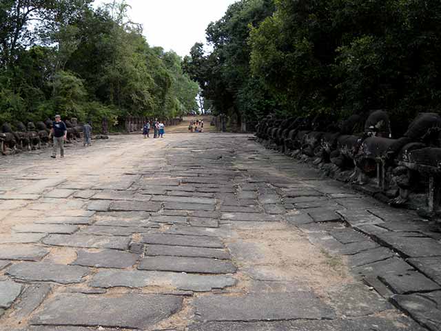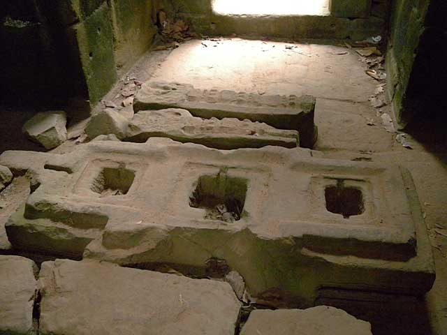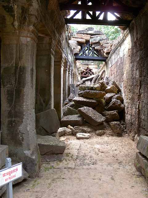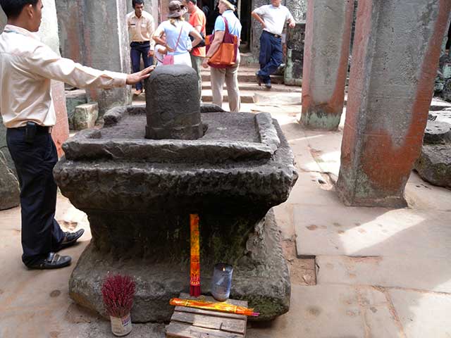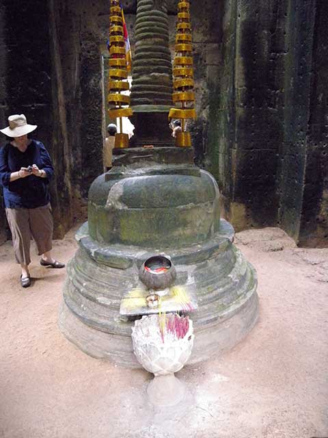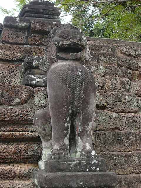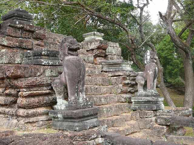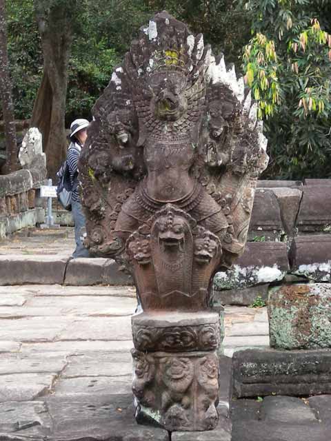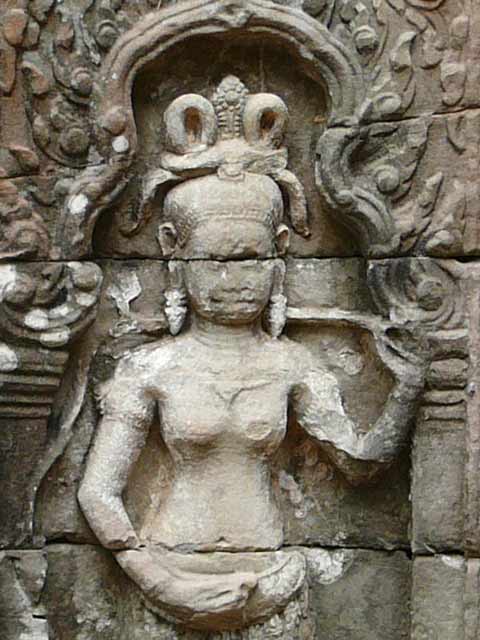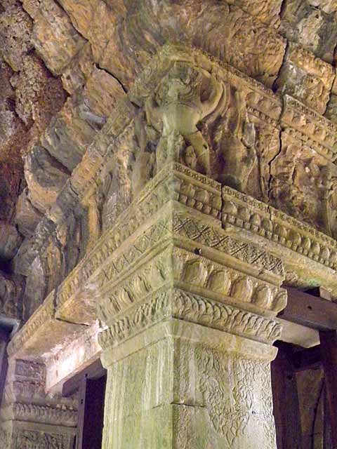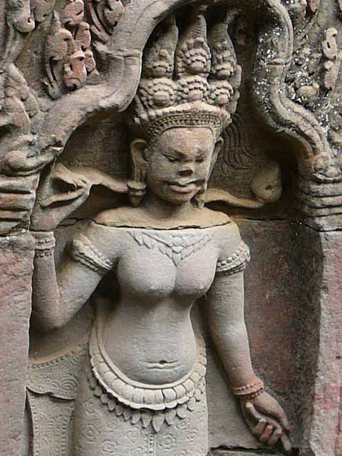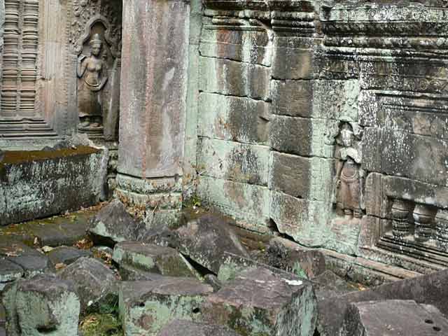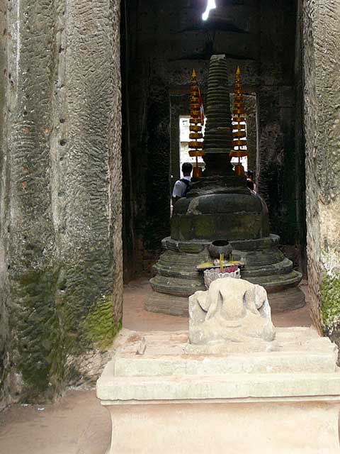 周壁にはヒンドゥー教の神鳥ガルーダの上に坐仏が彫られていましたが、ジャヤヴァルマン7世の死後、宗教的確執のため仏教の象徴である坐仏は削りとられています。