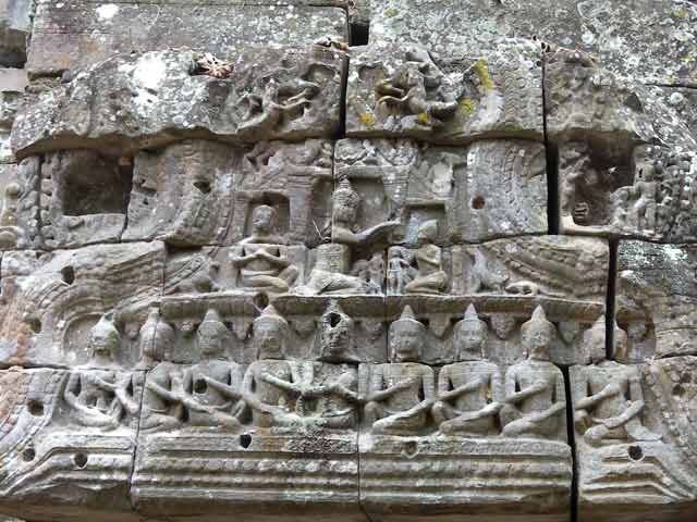 王子シッダールタの大出発や供物を受けるブッタなど、ジャータカを題材とした破風を見ることができます。